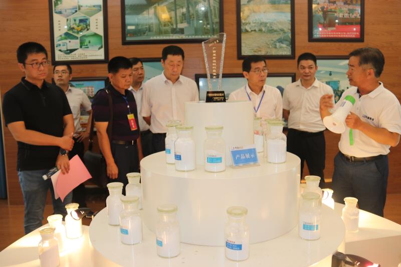接著,考察團(tuán)參觀了科隆公司展廳。 陸元鴻說,7月10日是科隆公司24歲生日,在科隆公司過24歲生日不久迎接各位領(lǐng)導(dǎo)和嘉賓的到來,是公司的榮幸。公司在重質(zhì)碳酸鈣行業(yè)深耕細(xì)耘20余年,獲得了“國(guó)家高新技術(shù)企業(yè)”、“中國(guó)碳酸鈣行業(yè)重鈣十強(qiáng)”、“全國(guó)五一勞動(dòng)獎(jiǎng)狀”、“國(guó)家知識(shí)產(chǎn)權(quán)優(yōu)勢(shì)企業(yè)”和“廣西重質(zhì)碳酸鈣工程技術(shù)研究中心”等殊榮,參與了《碳酸鈣分析方法》等國(guó)家標(biāo)準(zhǔn)及《工業(yè)用重質(zhì)碳酸鈣》等行業(yè)標(biāo)準(zhǔn)的制定。產(chǎn)品廣泛用于人造石、造紙、涂料、橡膠、塑料、油墨、建材及日用化工等行業(yè)。重質(zhì)碳酸鈣在各行業(yè)上主要是作為綠色環(huán)保填充料使用,它是目前最廉價(jià)的白色填充料,主要作用一是降低產(chǎn)品成本,二是改變產(chǎn)品性能。